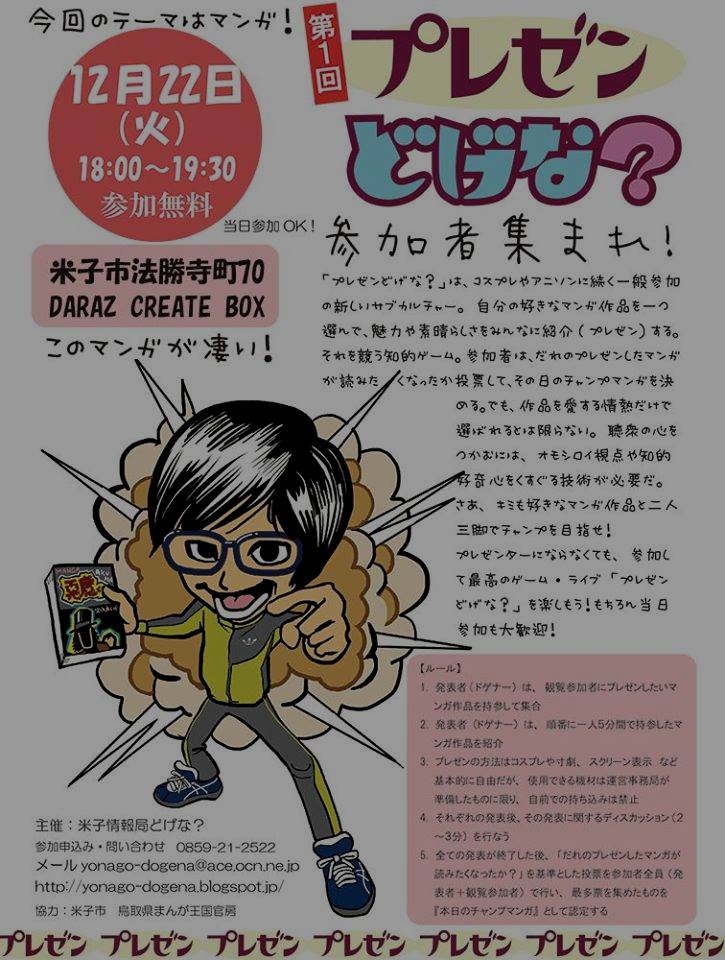 コスプレ、アニソンに続く一般参加のサブカルチャーとしてプレゼンを提唱する「米子情報局どげな?」は、一般参加型のプレゼンイベント第一弾として『第一回 プレゼンどげな』を開催します。第一回のテーマは漫画。プレゼン参加者は各々、自分の押す漫画の魅力をアピールし、観客の支持を競うとのこと。 場所: DARAZ CREATE BOX(ダラズ・クリエイト・ボックス) 関連リンク